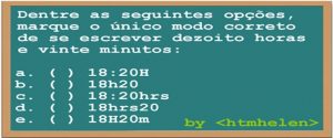 Ter uma forma correta de escrever as horas não é para ter frescura, mas sim para facilitar a comunicação. Se para você havia mais de uma forma correta no quadro, veja o que realmente está escrito em cada uma das opções: